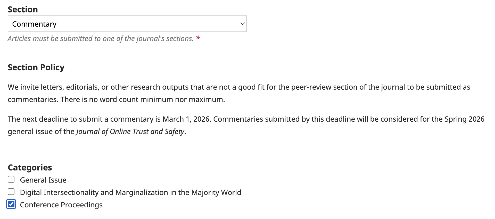 To be considered for Trust and Safety Research Conference Proceedings Issue, please click the "Conference Proceedings" box in Catergory Section.